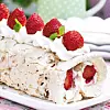 Ta undan några jordgubbar till garneringen, skiva resten och strö över grädden. Rulla ihop från långsidan och lägg på ett fat med skarven ned.