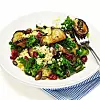 Du behöver Gör så här 1 Koka bulgur enligt anvisningarna på förpackningen. Skölj och repa bladen från grönkålen. Skär i grövre bitar och skiva auberginen...
