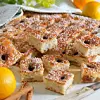 Tryck 40 små gropar i degen, enklast med tummen. Fördela fyllningen i groparna. Pensla med uppvispat ägg och strö på pärlsocker. Grädda i ca 15 minuter. Låt svalna och skär i rutor.