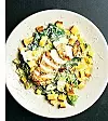 Krydda kycklingbrösten med salt, svartpeppar och lite olivolja. Stek dem i en het grillpanna tills de fått fin färg på båda sidor. Stek dem i ugnen tills köttet är vitt rakt igenom.