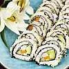 Lägg en sträng med ris, stavar av grönsaker och lite majonnäs i ena änden. Rulla ihop med hjälp av plastfilmen. Förvara täckt i kylskåp. Skiva upp före servering. Doppa rullarna i soja spetsad med wasabi.
