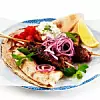 Servera cevapcici i pitabröd med fetaröra, picklad lök och hackade tomater.