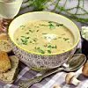 Ostkräm: Rör samman färskost, riven ost och persilja i en skål. Smaka av med salt och peppar. Garnera soppan med hackad persilja. Servera ostkräm och bröd till soppan.