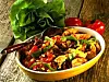 Bryn kycklingen i matfett. Rör ner lök och paprika och låt det fräsa med en stund.