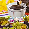 Servera med bitar av frukt och bär i skålar – antingen var sort för sig eller blandat. Sätt frukt och bär på fonduegaffeln och doppa i chokladen. Njut!