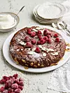 Vispa grädden fluffig och servera till den avsvalnade kakan tillsammans med rostade mandelspån och hallon, pudra över florsocker.
