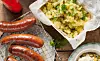 Servera korven med potatisstomp, gurkmajonnäs, senap och eventuellt ketchup.