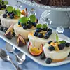 Ta upp desserterna ur formarna. Låt desserterna stå i kylen ett par timmar innan servering. Garnera med blåbär och passionsfrukt.