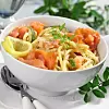 Vispa samman 2 msk olja, citronskal och -saft, honung, salt och svart-peppar i en skål. Blanda ner i pastan tillsammans med squashen och rör om. Servera i skålar och toppa med ost och laxrosor.