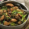 Stek under tiden kotlettbacon, lök, purjolök och svamp. Lägg ner det i grytan och låt den sjuda i ytterligare 5 minuter. Så långt kan du förebereda.