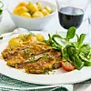 Låt paneringen torka något innan köttet steks. Stek köttet på medelvärme i en stekpanna med smör och rapsolja, ca 3 minuter per sida. Skär gärna upp köttet i breda remsor vid servering. Servera med blandad sallad och stekt potatis.