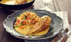 Servera kycklingfiléerna med grönsaksriset.