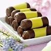 Kavla ut marsipanen till avlånga plattor och lägg en sträng fyllning på marsipanen. Rulla in fyllningen och skär marsipanrullen i 5 cm långa bitar. Doppa ändarna i smält choklad.