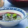 Hacka citronmeliss och kanelbasilika, och rör ner i krämen. Rör ut potatismjölet i vattnet. Häll ner redningen i krämen och rör om.