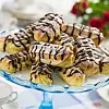 Lägg smeten i en spritspåse med ett stort krusigt tyll och spritsa 20–22 stycken, ca 8 cm, avlånga kakor på en plåt med bakplåtspapper. Grädda mitt i ugnen på 250° i 2 minuter. Sänk svärmen till 175° och grädda i totalt 20–25 minuter. Låt kakorna kallna på galler.