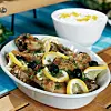 Strö över hackad persilja och oliver. Stick ner citronskivor.