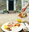 Stek baconet i stekpanna på medelvarm platta. Stek därefter korvar och potatisbullar varma i fläskfettet, och tillsätt tomathalvor samt champinjoner. Håll allt varmt under lock medan äggen steks i en annan panna. Fördela allt på rymliga, varma tallrikar och servera med nyrostat bröd.