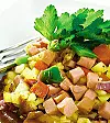 2. Tärna korven. Rensa paprikorna och tärna dem. Hacka rödlöken. Skala och tärna äpplet.