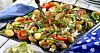 Lägg kyckling, potatis, tomater och lök på en oljad plåt. Rosta strax under ugnens mitt i 40–45 minuter.
