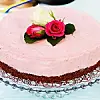 Rör ihop hallonpuré och äggsmet och vänd till sist ner den vispade grädden i omgångar. Rör försiktigt till en jämn smet. Fyll moussen i formen. Täck formen med bakplåtspapper och låt den stå kylen i minst 4 timmar, gärna över natten. Det går också bra att frysa in tårtan, men slå då in den i en ren plastpåse. Tänk också på att ta fram den i god tid för att tina. Dekorera med blommor eller färska bär vid serveringen.