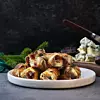 Dela filodegsarken på mitten så det blir 8 stycken. Lägg två bitar på varandra och riv ¼ av ädelosten över degen. Strö över ¼ av de hackade dadlarna på osten. Rulla ihop från kortsidan.