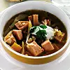 Blanda gräddfil med persilja och vitlök och servera detta till soppan. Ost och bröd är också gott till.