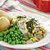 Baka i ugn ca 15 minuter, beroende på fiskens tjocklek. Servera med potatis och ärter.