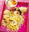 3 Trä omväxlande fiskbullar, gurkbitar, räkor och svamp på spett. Blanda olja och curry, pensla på fiskbullar och räkor. Hetta upp grillpannor eller stek-järn, grilla cirka 5 minuter på varje sida.