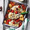 4 Lägg potatis, tomater, oliver och champinjoner runt fisken. Ringla över olivoljan. Sätt formen i mitten av ugnen och låt stå 15–20 minuter eller tills fisken är klar, känn med provsticka. Toppa eventuellt med färska timjanblad, servera med