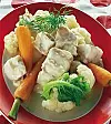 Smält smör i en annan kastrull och rör ner mjöl. Vispa ner det kokande grönsaksspadet. Koka upp. Lägg fisktärningarna i såsen och sjud dem cirka 5 minuter tills de är genomkokta. Lägg upp dem tillsammans med grönsakerna.
