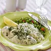 Lägg upp och strö över dill. Servera med kokt ris, ärter, pap-rika och citronklyfta.
