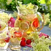 Lägg ner frukten i bringaren och fyll på med mineralvatten och is. Toppa med fläderblommor om det finns och servera direkt.