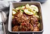 Skär kålen i grova strimlor. Skala och skär löken i klyftor. Dela och kärna ur äpplet och skär i klyftor.