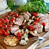 Rulla köttet i hackade örter och lägg i en form tillsammans med vitlök och tomater. Tillaga i ugn tills köttets innertemperatur är 65°, låt köttet vila i folie.