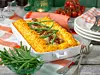 Potatismos: Skala potatis och sötpotatis och dela i bitar. Koka mjuka och häll av vattnet. Mosa potatisen och späd med mjölk. Rör i äggulor och ost och smaka av med salt och peppar. Spritsa moset runt kanten i formen.