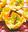 Skär filodegsarken i fyrkanter, cirka 10 x 10 centimeter. Tryck ner dubbla degark i formarna på en muffinsplåt (det går också att hänga degarken över upp- och nedvända ugnsfasta glas, klädda med bakplåtspapper) och grädda i 4-5 minuter i 200 grader. Ta ut degkorgarna och låt dem svalna.