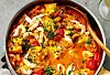 Smakrik och lyxig gryta med vit fiskfilé, räkor och grönsaker.