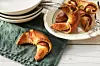 Trilla degen till en bulle på köksbänken och kavla till en rund kaka. Sporra fyra trekanter och lägg på fyllningen av mjukost och skinka. Rulla ihop varje trekant från den rundade kanten och inåt. Lägg på papprad plåt med degsnibbarna nedåt. Pensla med filmjölk och grädda 10–12 minuter mitt i ugnen.