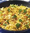 Fräs vitkål, paprika och vitlök i 3–4 minuter i en stor stekpanna med olja. Tillsätt ris och curry och stek i ytterligare 2 minuter. Knäck i äggen och blanda runt så att de blandas in i riset och stelnar. Vill man ha en torrare rätt kan man vändsteka äggen för sig och servera till.