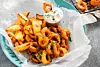 Hetta upp oljan till 180 grader. Fritera bläckfiskringarna i omgångar. Läggs för många i sjunker oljans temperatur och paneringen blir inte lika frasig. Fritera i cirka 2 minuter, till gyllene färg. Lyft upp ringarna med en hålslev och lägg dem på ett ugnsgaller med ­tidningspapper under. Servera med klyftpotatis och majonnäs.