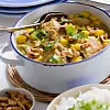 Ansa, snitta, skölj och skiva purjolöken. Skala och hacka vitlök och ingefära. Tillsätt purjolök, vitlök, ingefära, mango chutney och kokosmjölk, och låt sjuda ca 40 minuter. Rör om då och då. Kontrollera att köttet lossar lätt från benet.