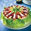 Garnera tårtan med späda salladsblad runt kanten. Rulla ost och kalkonkött till rullar och lägg runt kanten. Lägg vindruvorna emellan. Lägg solrosskott i mitten och några delade cocktailtomater och gurkskivor runt om. Servera med cider eller mousserande vin till.