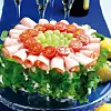 Dekorera kanten med ekbladssallat. Rulla kalkonpastramin och lägg runt kanten. Skölj och dela tomaterna och lägg dem innanför pastramin och vindruvorna i mitten. Låt stå kallt till serveringen.