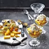 Skär bort skalet från apelsinen och skär ut filéerna. Skala och skär mango och physalis i mindre bitar. Skeda ut passionsfrukten ur skalet och vänd ner med frukten och finrivet limeskal.