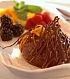 Servering: Hacka pistaschnötterna grovt. Ta ut moussen med en het sked ur formen och lägg upp vackert på en tallrik med apelsinfiléerna, strimlorna av skal och hallonen. Strö över nötterna och dekorera med myntablad och chokladgaller.