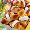 Lägg en klick fyllning på varje trekant och rulla ihop från breda sidan. Lägg gifflarna med skarven ner på en plåt med bakplåtspapper. Låt jäsa i 45 minuter. Pensla gifflarna med uppvispat ägg och grädda i 10 minuter. Låt svalna.