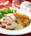 Skiva upp köttet och servera med potatiskaka och en sallad på sockerärter och apelsinbitar.