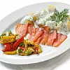 Dela lökarna i korta bitar. Ansa och strimla paprikan. Stek löken 5 minuter i olja på knapp medelvärme. Ta upp och fräs nu paprikan snabbt på lite högre hetta. Salta, peppra och vänd i sista dillslatten samt löken. Servera med 2–3 skivor gravad eller rimmad lax per portion.