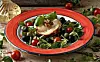 Lägg den varma osten på portionstallrikar med en bädd av sallad, tomat, oliver och dressing. Garnera med basilika och valnötter som på bilden.