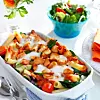 Blanda pasta, stekta grönsaker, stekt halloumiost, pastasås och spenat. Salta och peppra och lägg i en smord ugnsfast form.